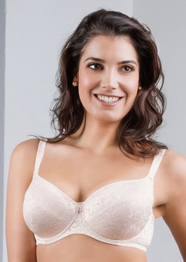 Hladká podprsenka z exkluzívneho žakárového úpletu s vysokým leskom má tenko vystužené košíčky s T-švami, ktoré formujú poprsie do prirodzene guľatého tvaru. Ramienka sú potiahnuté rovnakým žakárom a ponúkajú vysoký komfort pri nosení. Podprsenka je dostupná v jemnej púdrovej a netradične ružovej farbe s nádychom do fialova. Model je z dielne českého výrobcu spodnej bielizne Triola s viac ako 100 ročnou tradíciou .
